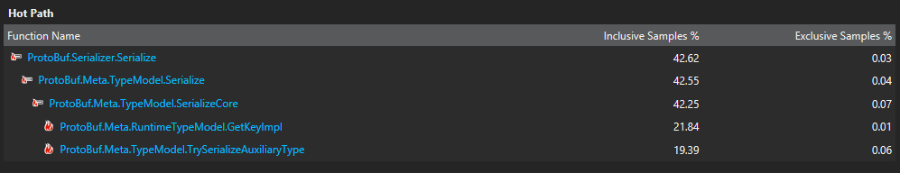 To do this we recorded about 10 minutes of live incoming data into a SQL database, downloaded it into a local SQL Server and wrote a simple console application that was able to process the recorded data exactly the same as the endpoints that showed the high cpu load. A quick run with the performance profiler of Visual Studio 2017 showed a surprising hot path: