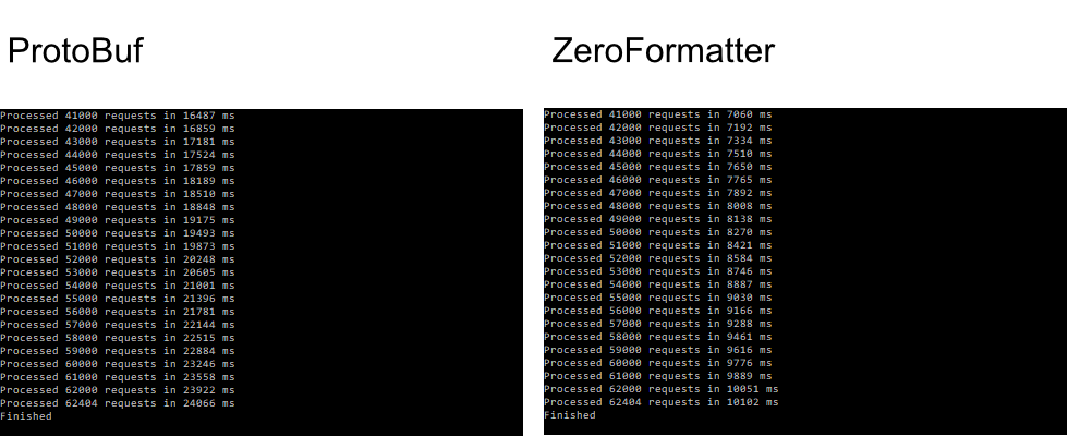 The results where amazing. Our benchmark using ZeroFormatter ran more than twice as fast compared to using ProtoBuf: