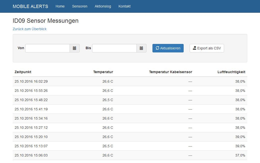 Das Mobile Alerts System sammelt die Daten zehntausender Sensoren. Neben den Mobile Alerts Apps kann jetzt auch die measurements.mobile-alerts.eu Website verwendet werden um aktuelle Sensoren-Messwerte und bis zu 18 Monate Historie anzuzeigen und zur weiteren Analyse und/oder Verarbeitung zu exportieren.