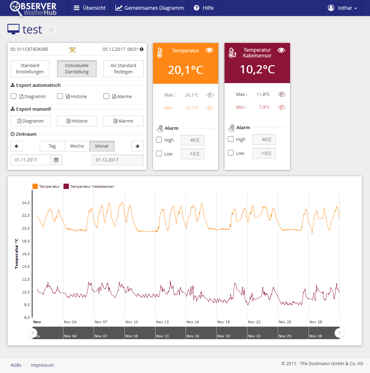 Für die TFA Dostmann GmbH & Co. KG haben wir eine Plattform zur professionellen Überwachung von Temperatur- und Luftfeuchte Sensoren erstellt. Messdaten werden dabei an einen bei Azure gehosteten Cloud-Dienst gesendet der diese entgegennimmt, abspeichert und bei Bedarf Alarme auslöst. Die aktuellen Messungen und Min-Max Werte können auf einer Website vom Kunden betrachtet, die Messungshistorie interaktiv, flexibel graphisch ausgewertet werden. Die Plattform bietet eine Vielzahl weiterer Möglichkeiten wie z.B. manueller und regelmäßiger automatischer Export von Daten, manueller und regelmäßiger automatischer Export von graphischen Auswertungen, Kontaktverlustalarme und vieles mehr.